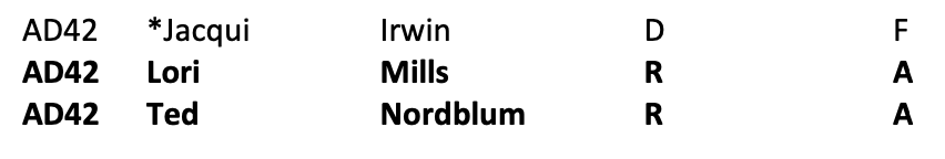 (Indivisible Conejo) For race against Jacqui Irwin (D) “Republican finalist Lori Mills is a far-right ideologue perfectly in line with #RobMob values, and is running an unsurprisingly obnoxious campaign. This race may be closer than we think, though, because the newly redrawn District 42 map is a bit redder than the old one.)
