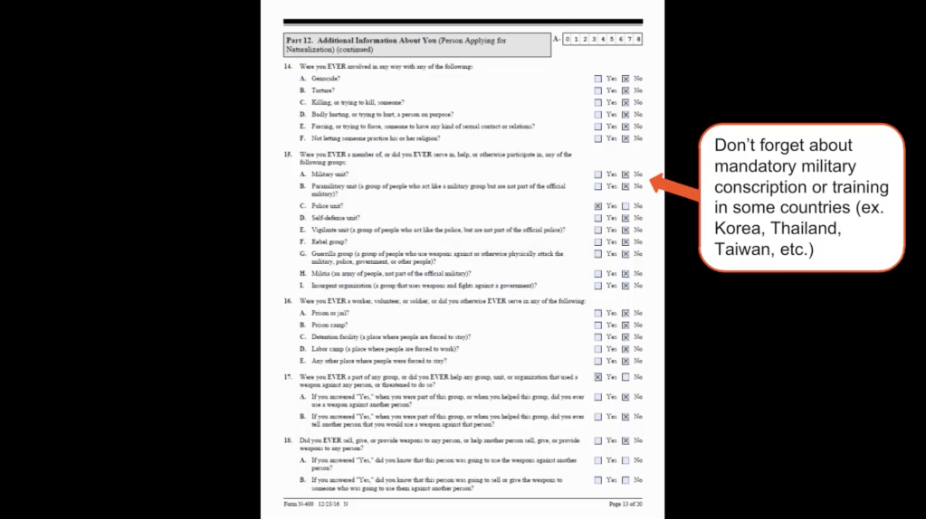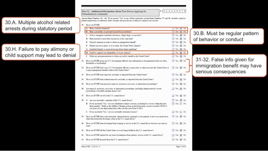- This is the part we talked about at the beginning. Please make sure your client knows that they need to be completely forthcoming and honest on this section or they can lose the right to become a citizen. Lying on this application can also get them kicked out later, like those old Nazi camp guards that keep turning up.