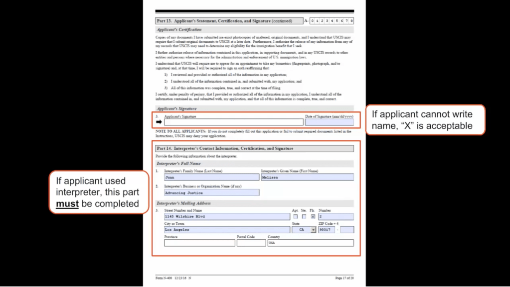 - Part 14 – #4 “Interpreter’s Contact Information” – Please insert (805) 486-9777. Leave #5 and #6 blank.