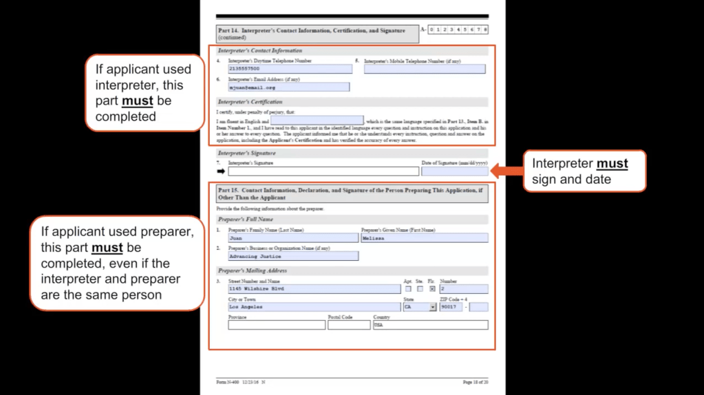 - Part 14 – #3: PREPARER writes in 301 South “C” Street, Oxnard, CA 93030 as the interpreter’s mailing address.