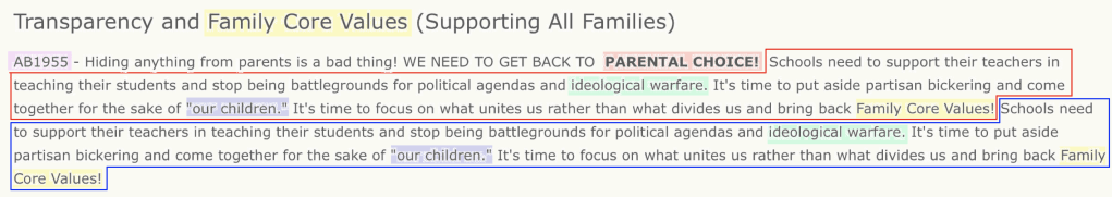 - “Truthful and Transparent” – This is also part of his version of “Family Core Values” and most likely part of his rage against AB1955. On a twitter feed, he goes all caps – “REAL ISSUE: YOUR LACK OF TRUST… AND YOU ARE AGAINST PARENTAL NOTIFICATION!! I will change it on Day 1… CVUSD will notify parents!! When someone hides something from a parent it is evil!!”