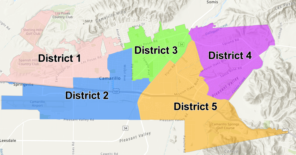 Camarillo voting information here. The next City Council election will be held on November 8, 2022 for three City Council seats in Districts 1, 2, and 5. Check what district you live in here.